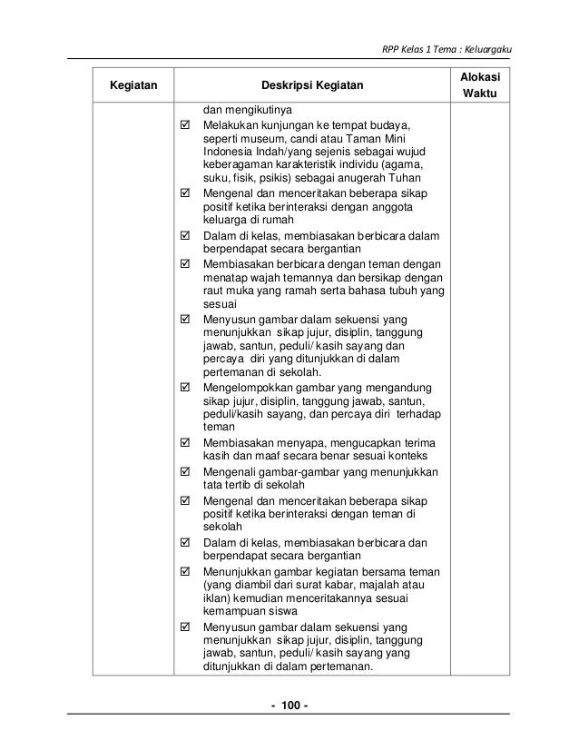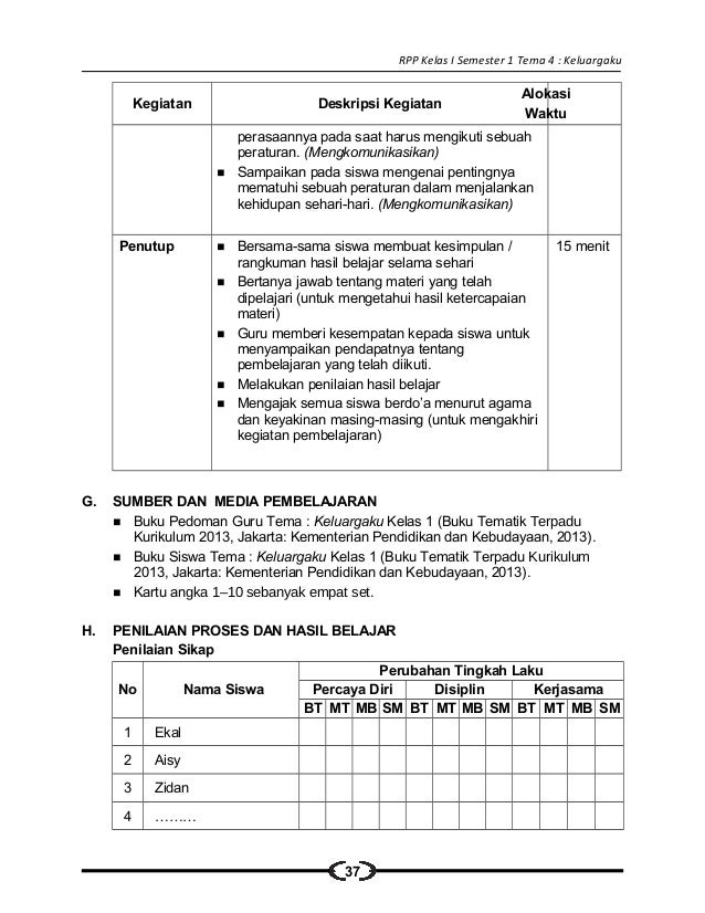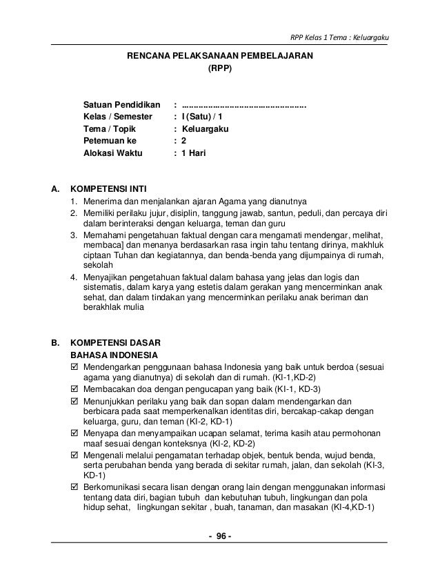Detail rpp 1 halaman kelas 1 tema 4 lengkap lampiran. Ini dia update 2018 rpp tematik kelas 1 sd tema 4 kurikulum 2013 revisi 2017 untuk itulah admin membagikan materi terkait, materi yang bisa dimanfaatkan oleh guru dalam penyusunan perangkat pembelajaran rpp. Aku dan keluargaku (4, 5, dan 6) oleh admin selasa, februari 01, 2011 rencana pembelajaran tematik. Menerima dan menjalankan ajaran agama yang dianutnya 2. Rencana pelaksanaan pembelajaran (rpp) tematik terpadu terintegrasi ppk kelas 1 semester 1 tema 4 keluargaku subtema 1 anggota keluargaku pembelajaran 1 disusun oleh: