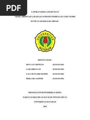 Laporan praktik kerja lapangan ini disusun sebagai gambaran hasil pekerjaan yang telah dilakukan selama pkl dengan tujuan memenuhi . Laporan hasil observasi pembuatan tempe disusun oleh: Tempe diminati oleh masyarakat, selain harganya murah, juga memiliki kandungan protein nabati yang tinggi. Jamur apa yang berperan dalam proses pembuatan tempe ? Lembar pengesahan laporan lengkap praktikum pengantar bioteknologi dengan judul "pembuatan tempe" yang disusun oleh :